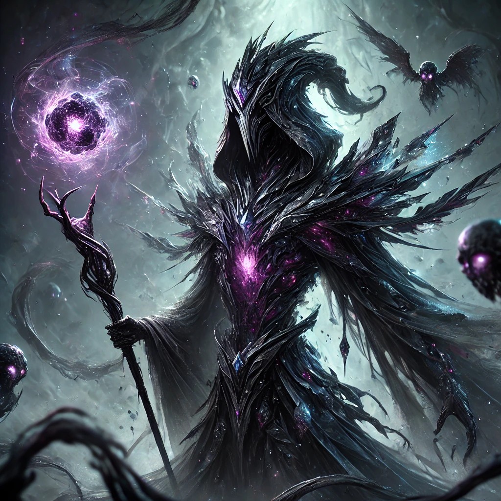 A sinister crystal wizard stands tall, forged from translucent black, deep purple, and smoky grey crystal, pulsing with the essence of the death element. Its flowing crystal robe shimmers like frozen shadow, with dark energy veins glowing faintly as they snake through its crystalline form. The wizard’s eyes glow with a ghostly pale light, empty yet intense, radiating ancient, forbidden knowledge.
