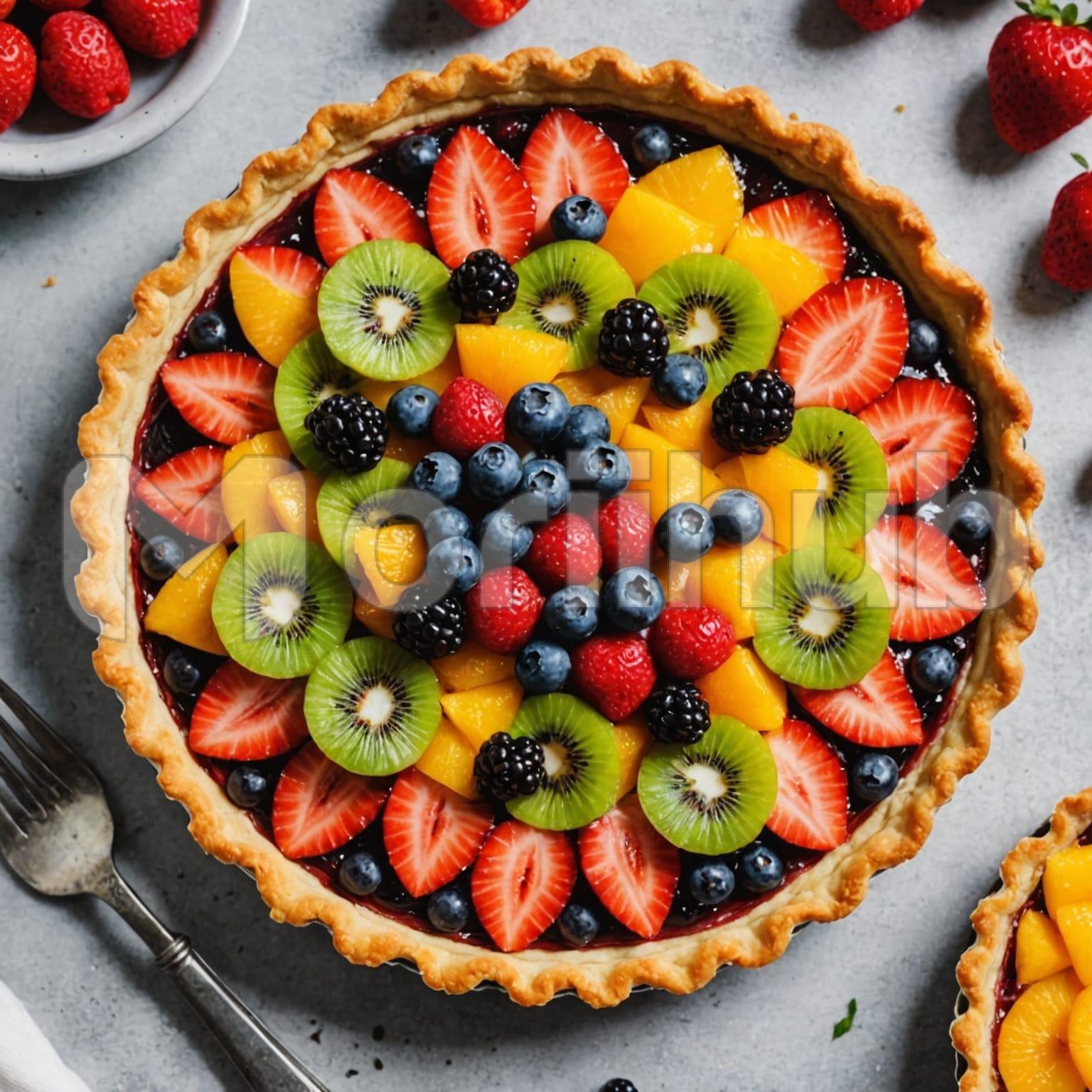 A fruit tart rests elegantly on a table, its golden crust perfectly crisp and inviting. The tart is adorned with a vibrant assortment of fresh fruits, arranged in a colorful mosaic. Juicy berries and succulent kiwi are artistically placed, each fruit adding a burst of natural sweetness and texture. The smooth, creamy filling peeks through between the fruits, adding richness to the dessert. The tart’s presentation is both beautiful and appetizing, making it a delightful centerpiece for any table.