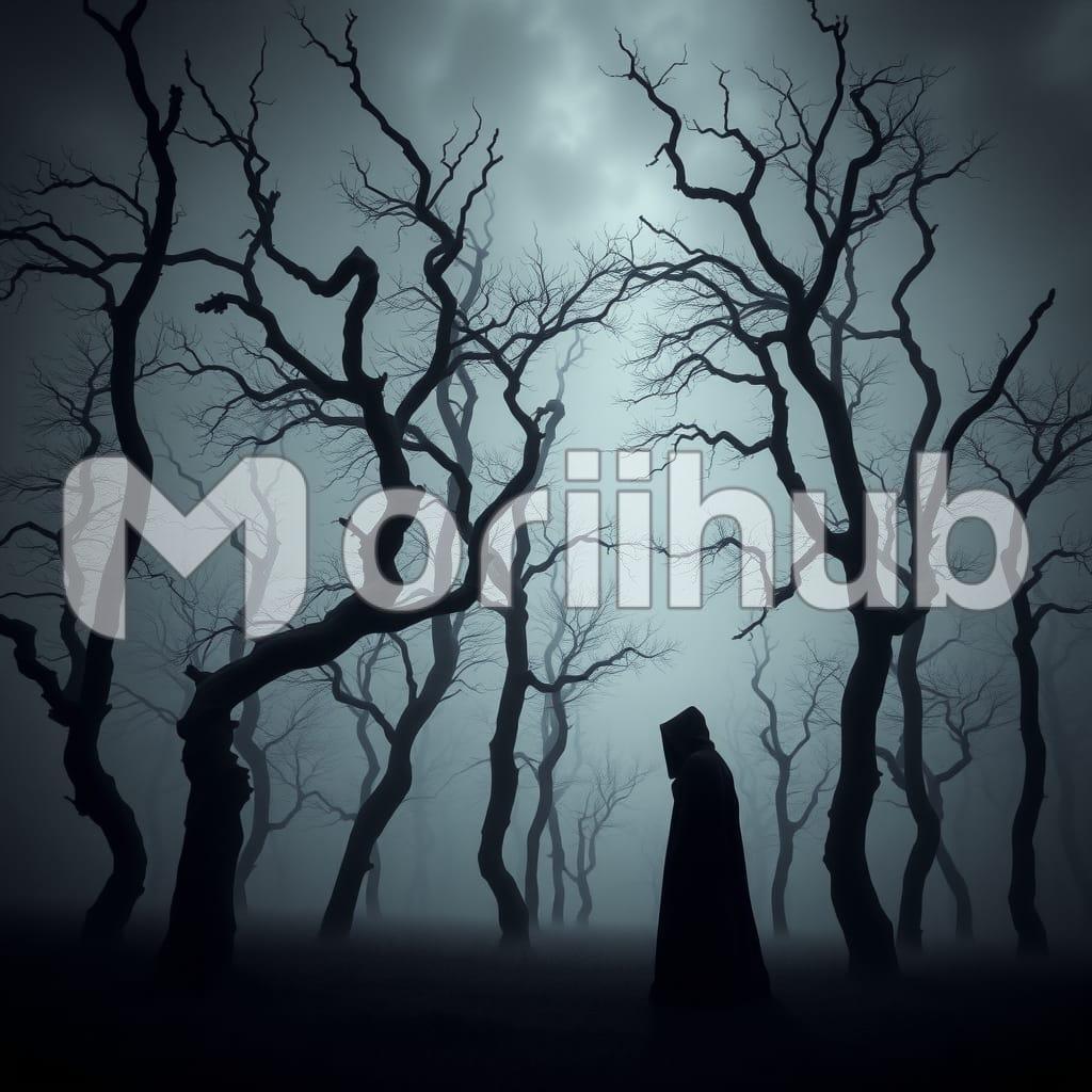 A cloaked figure moves silently through a dark, eerie forest, shrouded in shadows. The tattered cloak drapes around them, blending with the dim surroundings. Withered trees stretch upwards, their gnarled branches twisted and barren, casting long, haunting silhouettes across the forest floor. The air is heavy with an unsettling stillness, broken only by the faint rustling of leaves. The figure’s presence adds an air of mystery and foreboding, as they navigate the desolate landscape where the forest’s desolation seems to whisper secrets from the past.