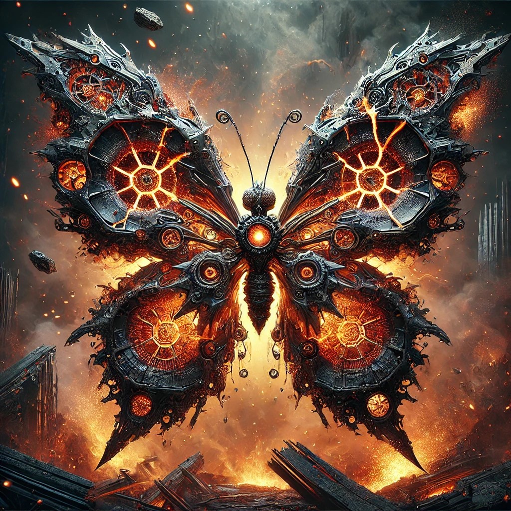 The artwork depicts a formidable destruction butterfly automaton, an awe-inspiring fusion of mechanical craftsmanship and the raw power of annihilation. Its jagged metallic wings are scarred with glowing cracks, emitting intense, molten light in fiery oranges and reds, reminiscent of magma veins. The edges of the wings appear fragmented and unstable, constantly releasing sparks and embers, as though breaking apart under the weight of its destructive energy.