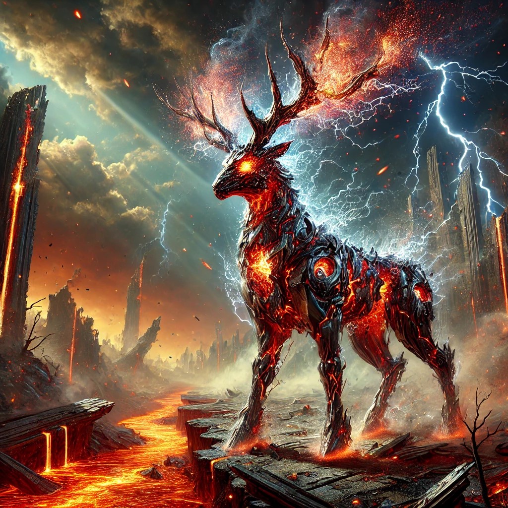 The image showcases a destruction-themed deer automaton standing amidst an apocalyptic wasteland, embodying chaos and devastation. Its body is constructed from jagged, fractured metallic plates, with fiery cracks glowing in intense shades of red and orange, as though molten energy courses through its frame. The automaton’s sharp, fragmented antlers emit sparks and embers, radiating a fierce, destructive power. Its eyes burn with a blazing crimson light, exuding raw energy and an ominous presence.