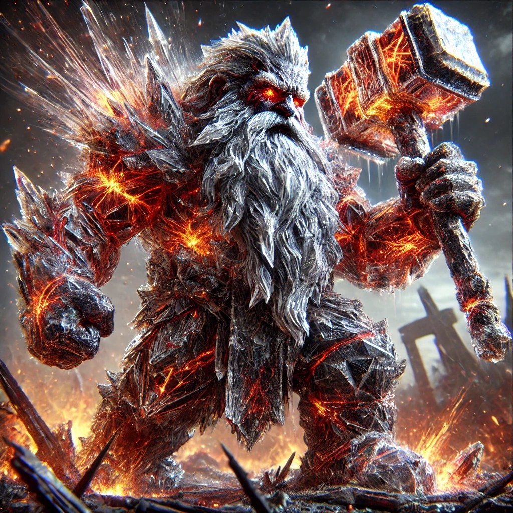 A crystalline sculpture of a dwarf, crafted from rough, jagged crystal that conveys strength and resilience. The dwarf’s muscular build and fierce expression are etched into the crystal with intricate detailing, and his thick beard adds to his rugged appearance. He holds a massive, glowing hammer, which appears cracked and is radiating destructive energy. The crystal pulses with fiery streaks of red, orange, and black, representing the destruction element.