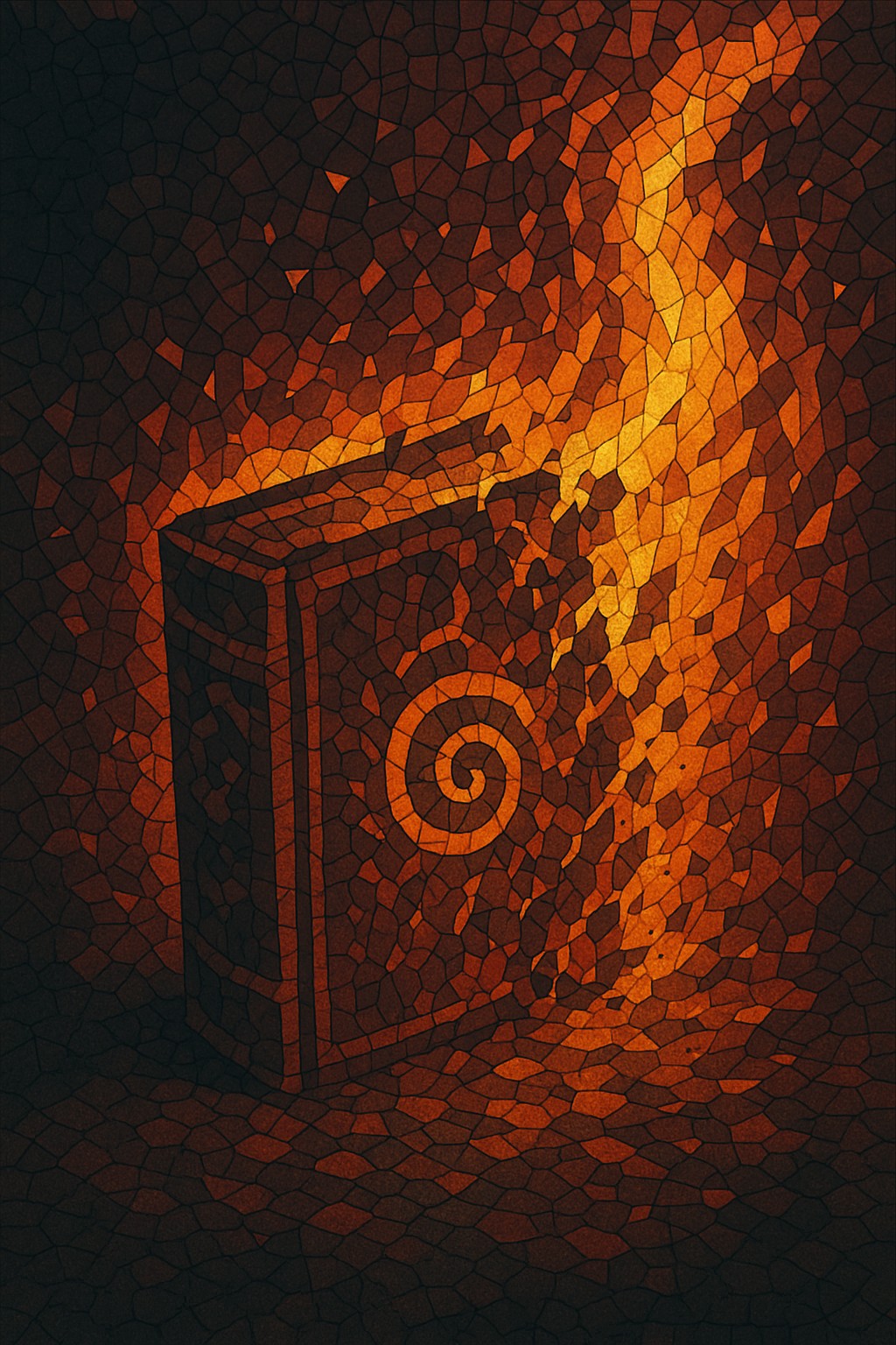 This artwork is a digital abstract mosaic shaped like a mystical grimoire. The book appears ancient, with a spiral emblem glowing on its cover. The mosaic is built from tessellated fragments in fiery hues — deep reds, oranges, and golden yellows. Flames and shards of light seem to erupt from the grimoire, symbolizing the element of destruction.