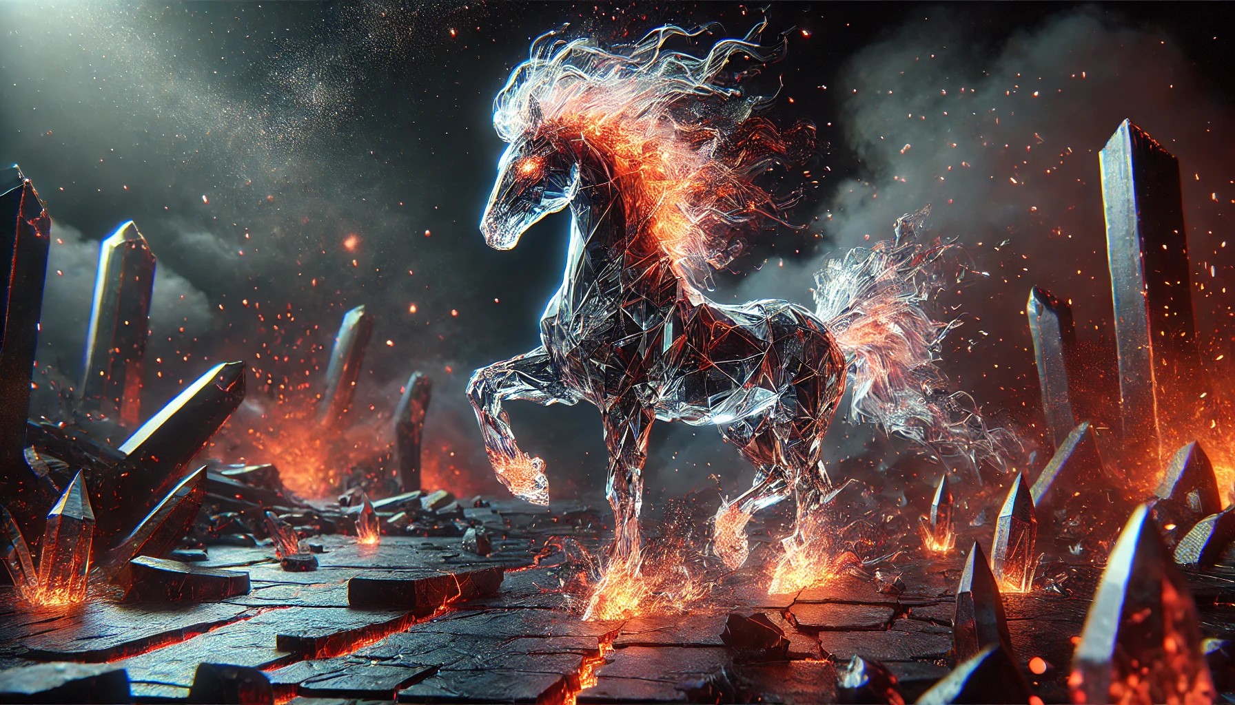 The image depicts a breathtaking crystalline horse infused with the essence of destruction. Its entire body is sculpted from jagged, translucent crystal shards that glow with fiery red and dark energy veins, resembling molten lava trapped within a delicate yet unbreakable form. The horse’s mane and tail are not solid but composed of swirling embers and black smoke, flickering like living fire.