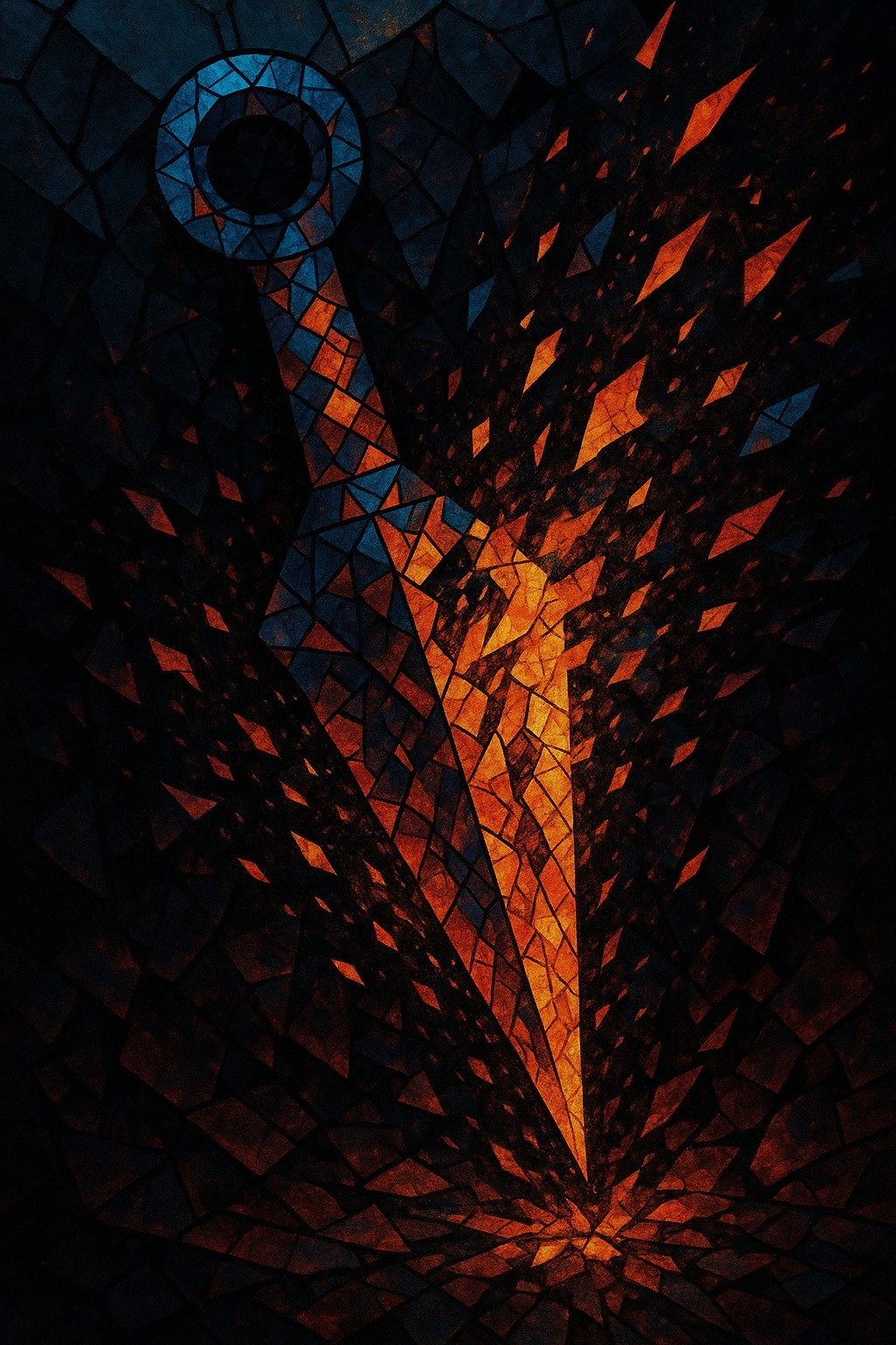 This image is a digital abstract mosaic shaped like a kunai — a traditional ninja weapon — and infused with the element of destruction. The design is made up of sharp, angular shards arranged like stained glass, forming the silhouette of the kunai. The color palette is dominated by fiery tones — glowing oranges, reds, and yellows — contrasted with cool blue and black shards. The kunai appears to be piercing or shattering the surface, releasing an explosive burst of fragments, symbolizing a forceful, destructive impact.