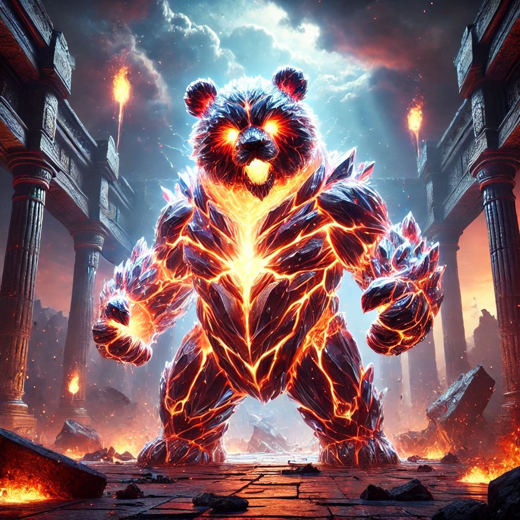 The image showcases a formidable crystal panda infused with the destruction element, standing powerfully amidst the ruins of a mystical temple. Its massive body is sculpted from translucent, glowing crystal, with deep cracks pulsing with fiery energy. The panda’s piercing eyes burn with an intense molten glow, exuding raw destructive power. Its powerful claws radiate dark energy, distorting the air around them.