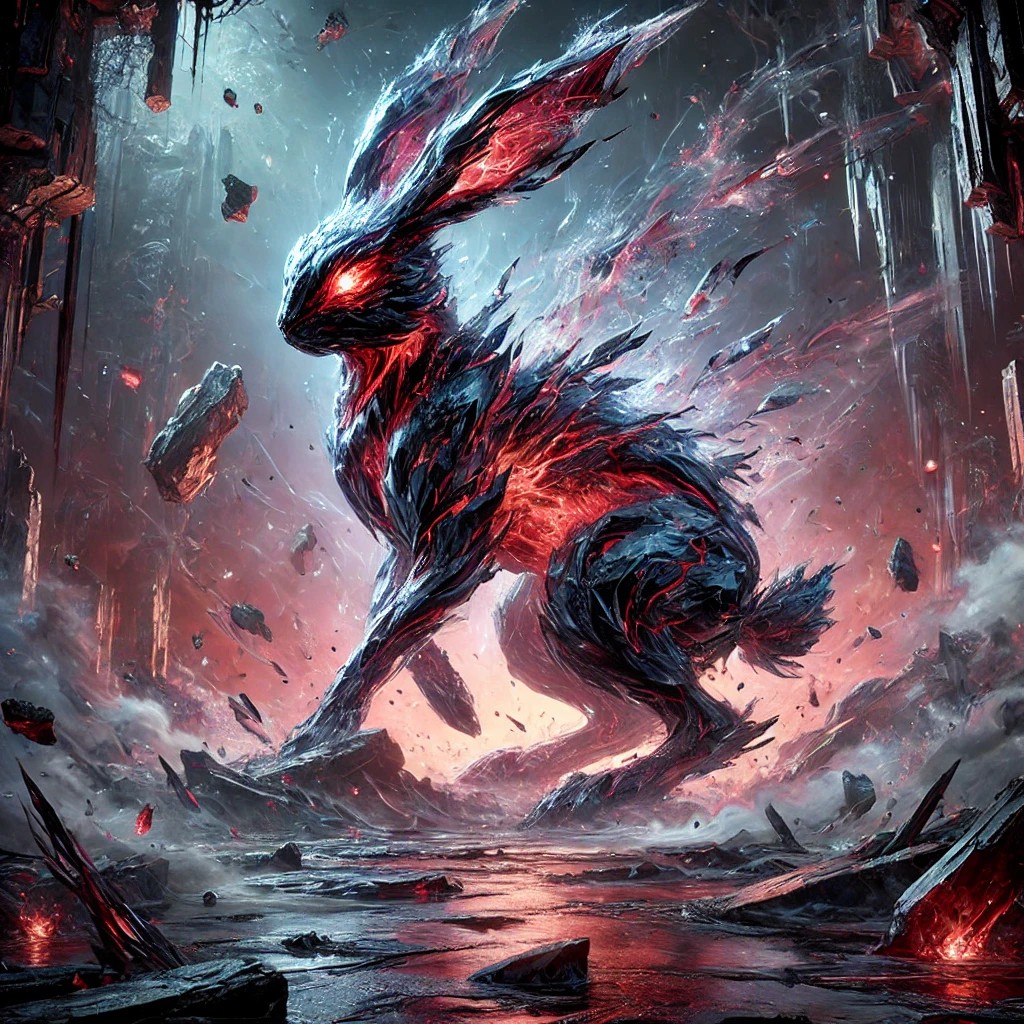 The image features a formidable crystal rabbit infused with the destruction element, standing ominously in a shattered, mystical landscape. Its sleek, translucent body is sculpted from dark-glowing crystal, with veins of red and black energy pulsing through its form. The rabbit’s piercing eyes blaze with chaotic power, exuding an aura of instability and raw destruction. Its long, jagged ears crackle with unstable energy, sending sparks into the air. As it moves, the ground beneath it fractures and crumbles, leaving behind smoldering cracks and traces of devastation.
