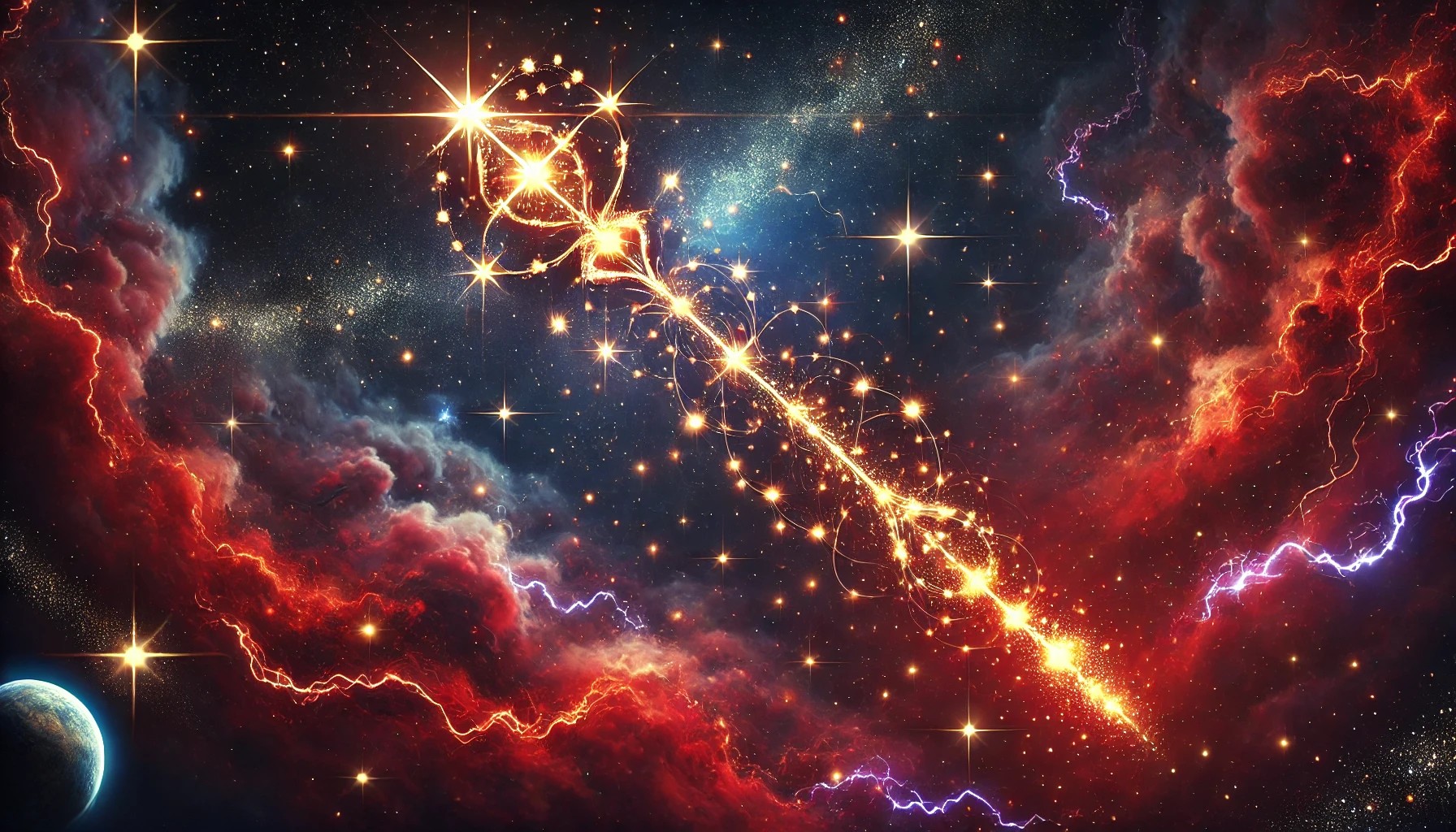 The image depicts a glowing constellation in the shape of a majestic, cosmic scepter suspended in the vast night sky. The scepter is formed by blazing stars linked by fiery, glowing lines, with a gem-like, radiant tip at its crown. Surrounding it are violent bursts of destructive energy, represented by red and orange flames intertwined with crackling black lightning arcs, symbolizing cosmic chaos.