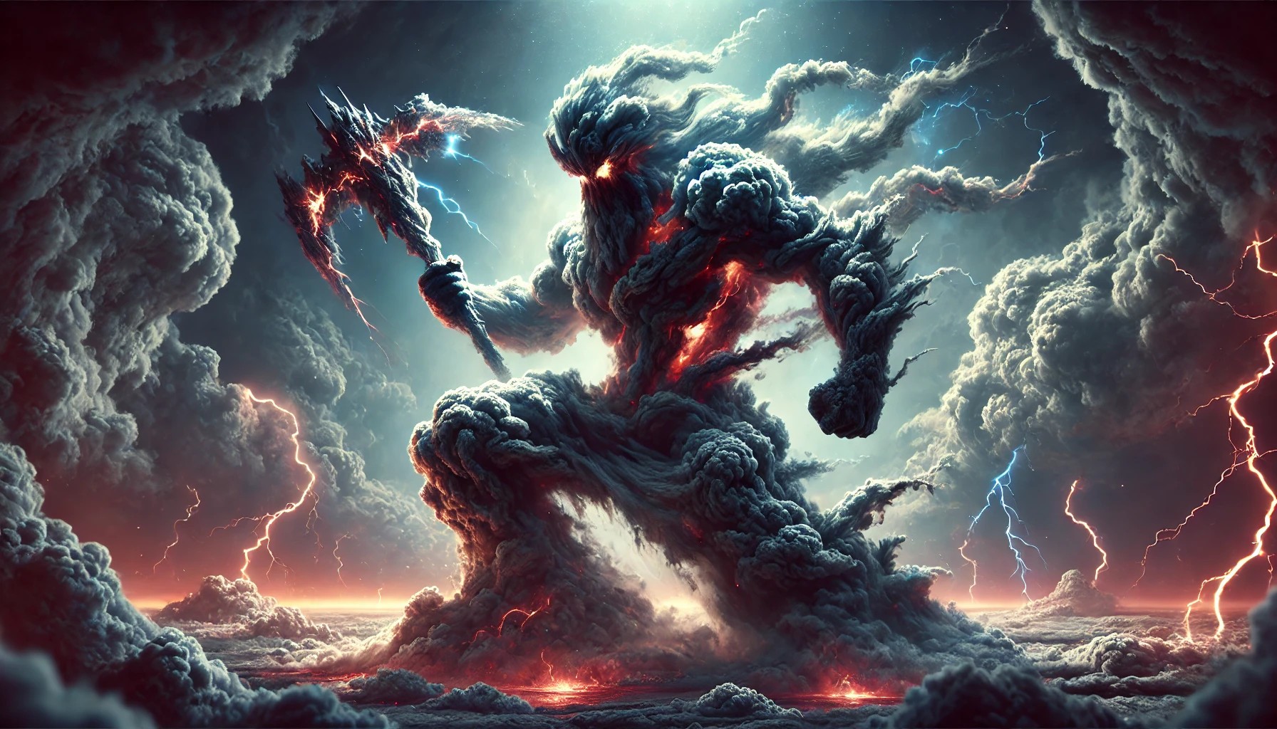A massive, mythical warrior takes form in the swirling clouds, its muscular body composed of stormy vapors and crackling with lightning. The warrior wields a colossal battle axe, with arcs of electricity flowing around it like veins of destruction. Its helmeted head emits an ominous glow from its eyes, symbolizing raw, elemental power.