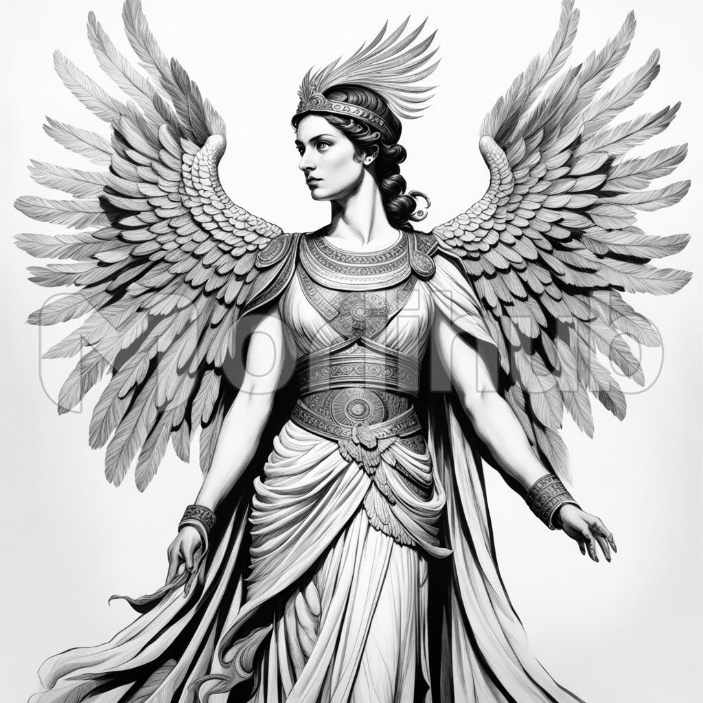 A celestial goddess, resplendent in a painting, gazes sideways with regal allure. Graceful wings extend from her ethereal form, a symbol of divine presence. Adorning her head, an elaborate coronet exudes majesty, framing her visage with celestial splendor. The goddess, caught in a moment of divine contemplation, becomes an embodiment of timeless beauty and power, inviting reverence and admiration for the mythical elegance portrayed on the canvas.