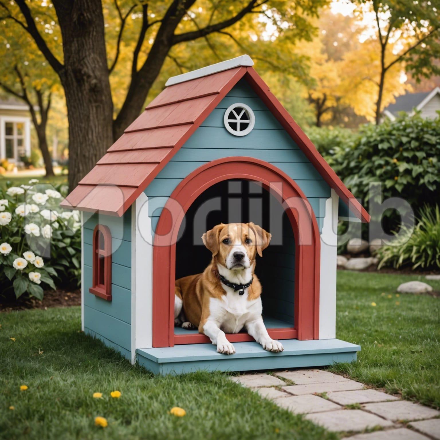 In the tranquil yard, a loyal dog reclines within its cozy shelter, nestled amidst vibrant greenery. With a steadfast gaze, it rests comfortably, its eyes fixed on the horizon. Its fur, a blend of earthy tones, harmonizes with the lush foliage surrounding it. Ears drooped, it listens to the rustle of leaves, a soothing melody in the gentle breeze. Amidst this verdant oasis, the dog remains a symbol of quiet watchfulness, a serene presence amidst the natural splendor of its home.