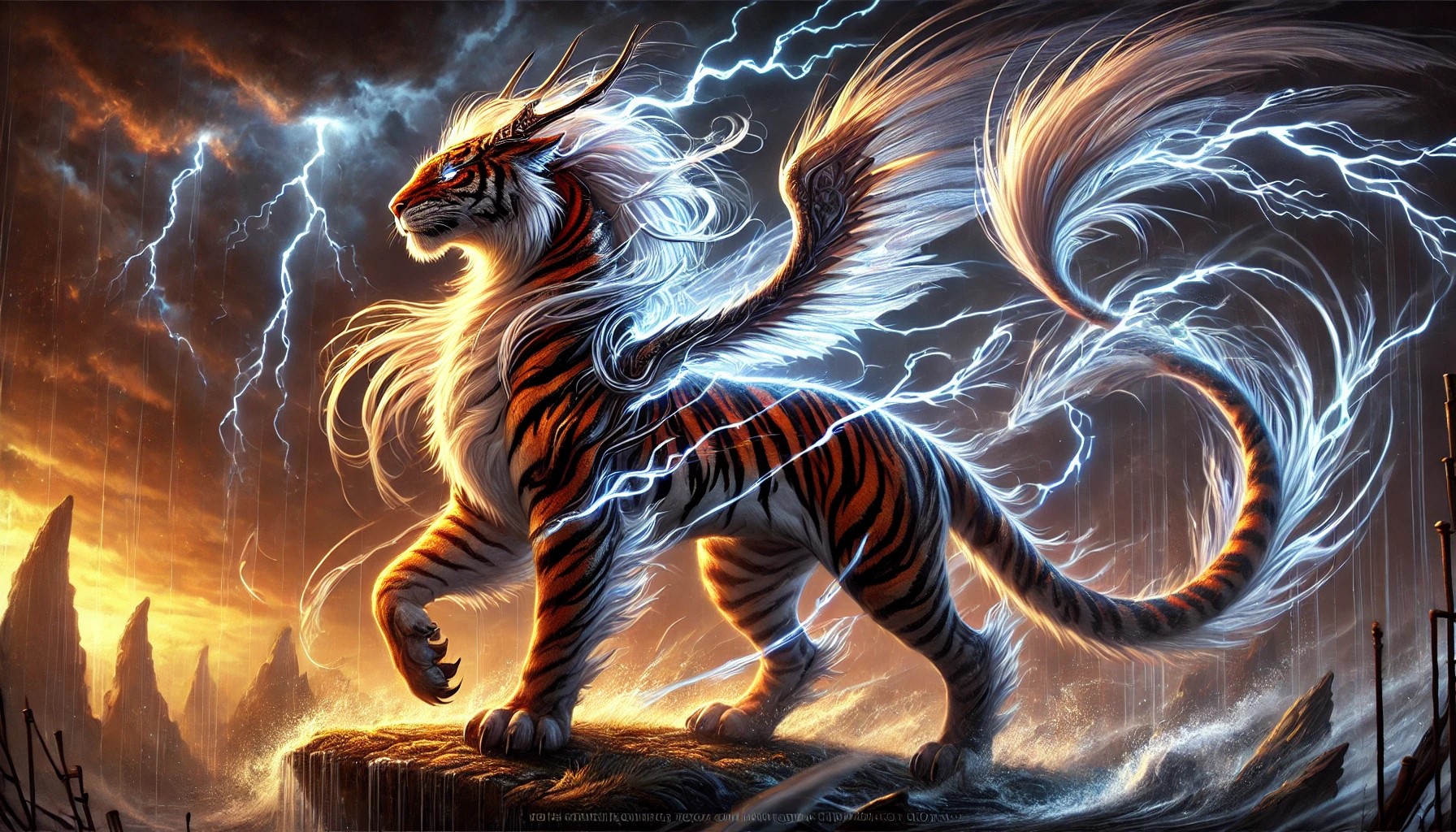 A majestic dragon-tiger hybrid creature stands poised in a dramatic landscape, embodying the elements of lightning and wind. The creature has the powerful, muscular body of a tiger, with sleek fur that transitions from vibrant orange and black stripes to shimmering scales along its spine and tail. Its head is a fierce blend of dragon and tiger features, with piercing, glowing eyes and sharp, electrifying whiskers. From its back sprout ethereal, translucent wings that resemble wind currents, swirling with energy.