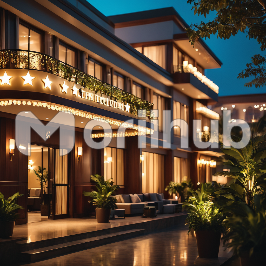 Under the moonlit sky, a 5-star hotel transforms into a beacon of luxury amidst the cityscape. Its towering silhouette adorned with twinkling lights casts a mesmerizing reflection on the tranquil waters below. The elegant architecture and lavish amenities stand out against the dark backdrop, creating a scene of opulence and sophistication. Guests bask in the serenity of the night, enveloped in comfort and indulgence, while the glittering skyline provides a stunning backdrop for unforgettable memories.
