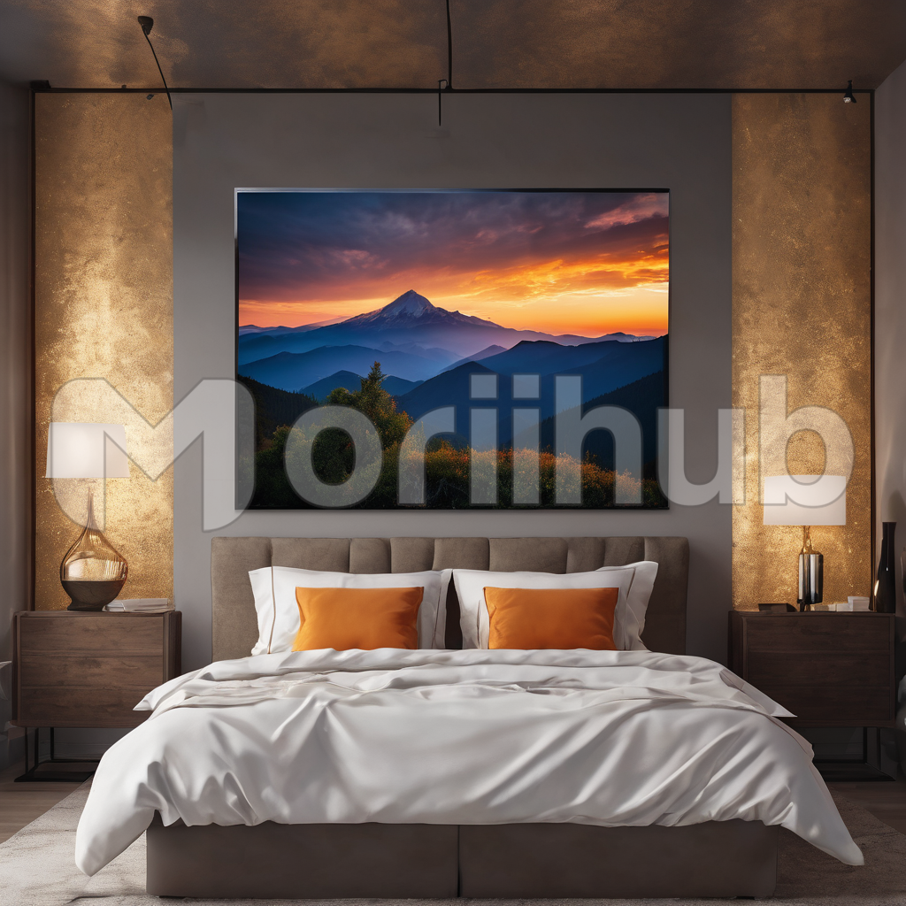 In the tranquil embrace of the bedroom, a bed occupies the center stage, inviting relaxation and repose. Soft lamplight emanates from lamps flanking either side, casting a warm glow that bathes the room in a soothing ambiance. Above the headrest, a piece of art hangs, adding a touch of personality and charm to the space. It’s a haven of comfort and style, where every detail converges to create a sanctuary of rest and rejuvenation.