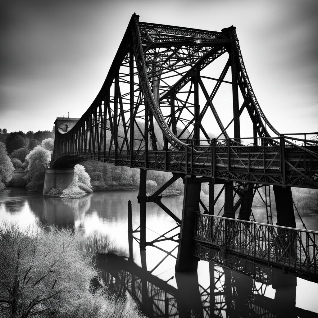 In the monochromatic stillness, an overhead bridge spans across a calm river, a stark composition against the muted canvas of a dull grey sky. The bridge, rendered in black and white, stands as an architectural silhouette, its lines and arches creating a geometric dance against the somber backdrop. The tranquil river reflects the bridge’s elegant form, enhancing the sense of symmetry. This grayscale scene evokes a quiet serenity, where simplicity meets the subdued beauty of an overcast day.