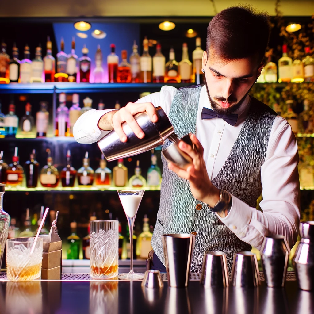 In the chic ambiance of a stylish bar, a skilled barman commands attention as he mixes a cocktail with precision and flair. With practiced hands, he expertly pours ingredients into a shaker, each movement a testament to his artistry. The clink of ice and the aromatic notes of spirits fill the air, creating an atmosphere of anticipation and delight. As he shakes the concoction with finesse, patrons watch in awe, eagerly anticipating the creation of their next libation.
