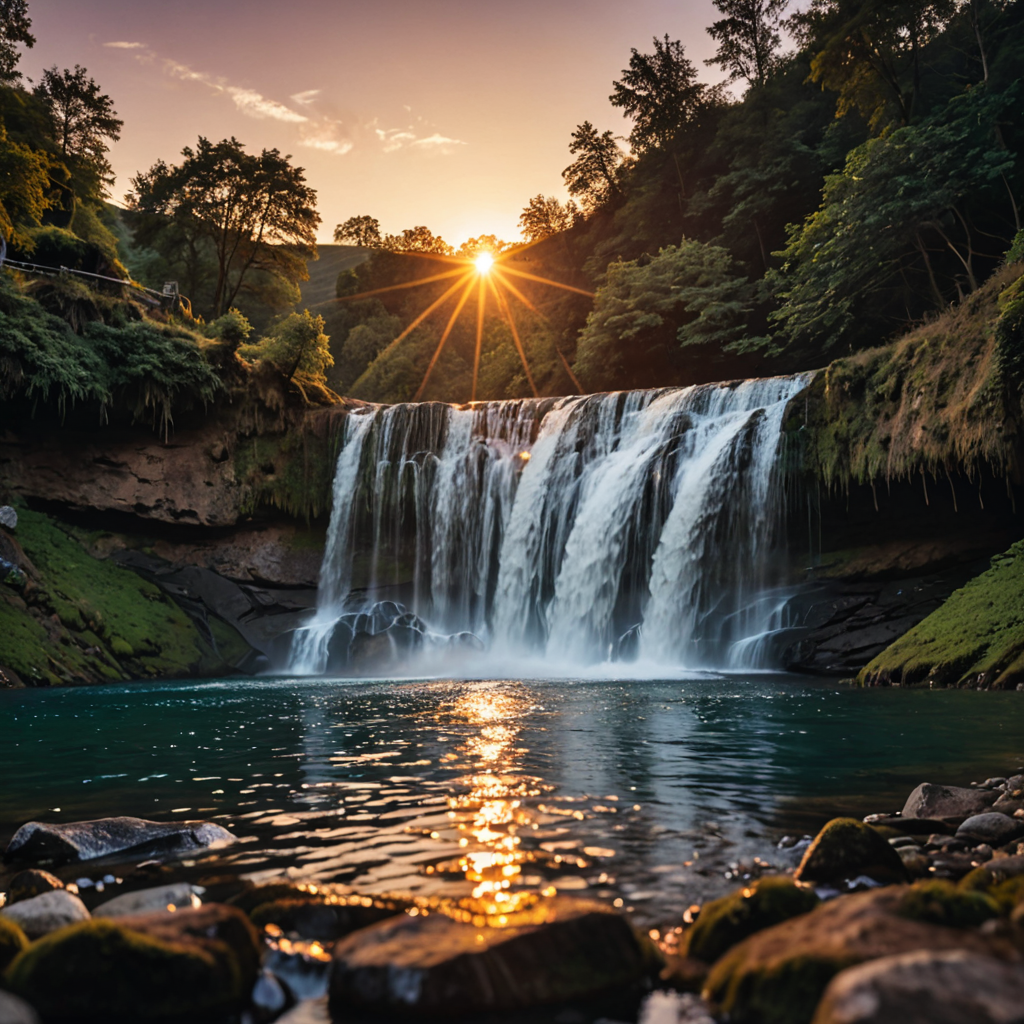 As the sun dips below the horizon, casting a warm glow over the landscape, a waterfall glistens in its golden light. Framed by lush greenery, the cascading waters take on a radiant hue, reflecting the vibrant colors of the sky above. In this picturesque scene, the beauty of nature is magnified, creating a moment of tranquil serenity amidst the wilderness.