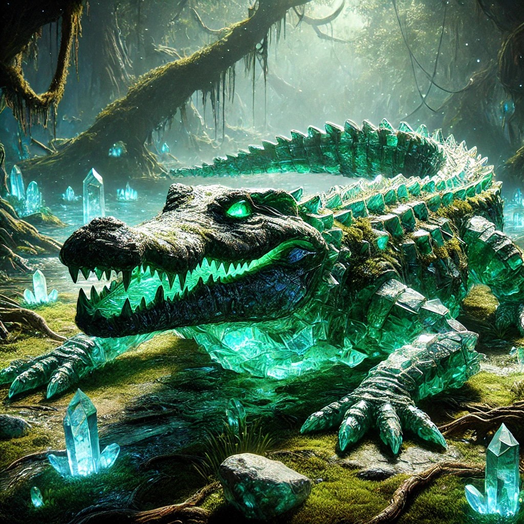 The image showcases a majestic crystal crocodile infused with the earth element, resting in an ancient, mystical swamp. Its massive body is sculpted from translucent, emerald-green crystal, with rugged, stone-like scales embedded with glowing veins of earthly energy. The crocodile’s piercing eyes radiate deep, primal wisdom, while its immense crystalline tail, resembling solid rock, leaves cracks in the ground as it moves.