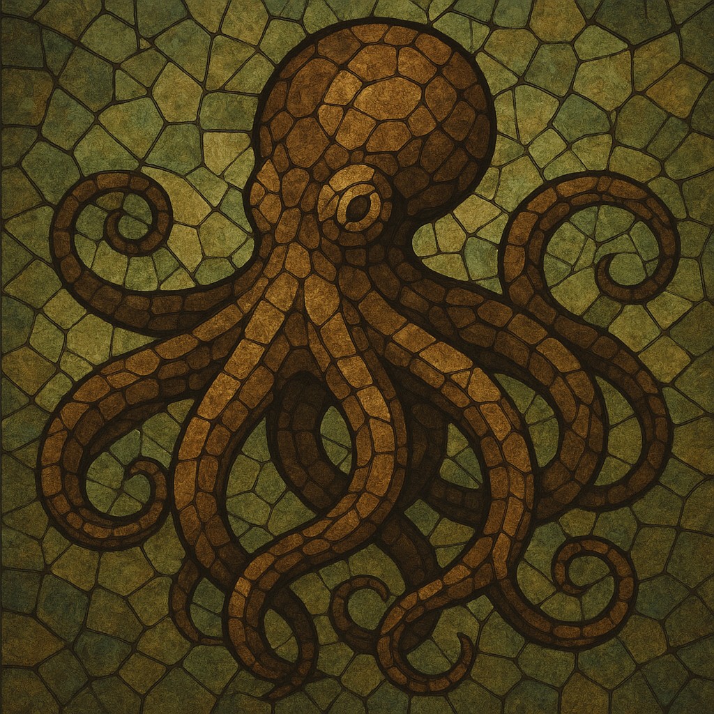 This image features a digital abstract mosaic in the shape of an octopus, rendered with an earthy aesthetic. The octopus is composed of irregular, tile-like segments in rich browns, muted greens, and warm ochres, resembling stained glass or ceramic tesserae. Each tentacle flows with graceful curves, filling the composition, while a prominent eye draws attention to the octopus’s head.