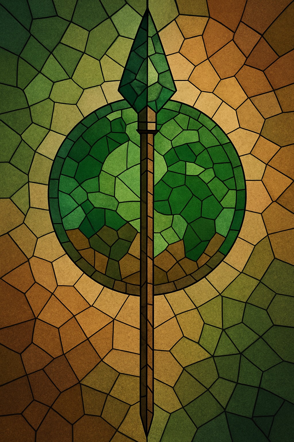 This digital abstract mosaic features a striking spear as its central motif, crafted from interlocking geometric shapes in a palette of earthy tones. The spear’s tip gleams with deep forest greens, transitioning into warm browns and golden hues along its shaft, symbolizing strength rooted in nature. Behind it, a circular form composed of fractured green and brown tiles evokes the Earth element, anchoring the composition with grounded energy.