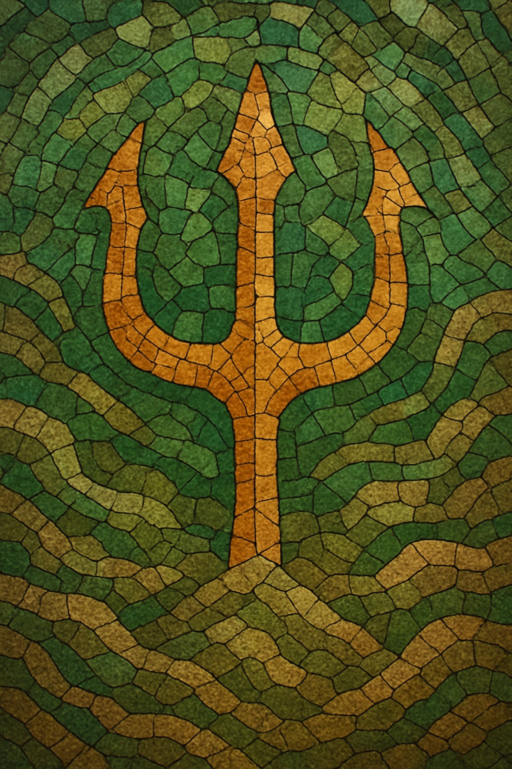 This image is a digital abstract mosaic featuring a trident as the central figure. The trident is composed of warm-toned tesserae in shades of amber, ochre, and burnt orange, giving it a bold, fiery presence. It’s set against a richly textured background made of green, brown, and beige tiles, arranged in organic, swirling patterns to evoke the earth element — resembling rolling hills or layers of soil and stone.