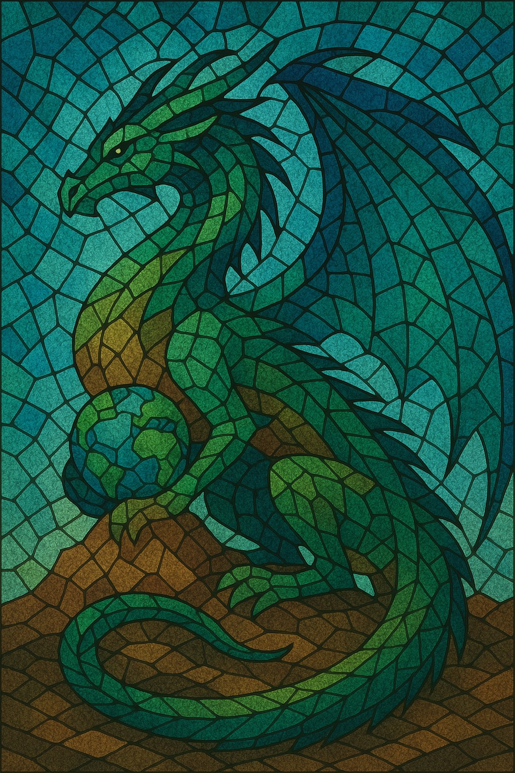 This image is a digital abstract mosaic depicting a Western-style dragon with an earth element theme. The dragon is designed in a stained glass or mosaic tile pattern, where each segment is formed from distinct geometric pieces in earthy tones — greens, browns, blues, and hints of gold and turquoise. The dragon has a powerful, coiled posture, wings extended behind it, and claws grasping a globe-like sphere that symbolizes the Earth.