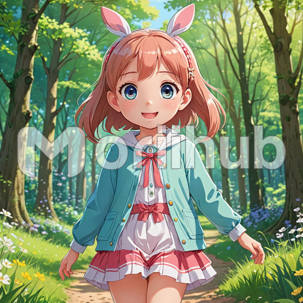 In the heart of the woods, an animated girl strolls amidst the towering trees, a rabbit ear headband adorning her hair. Each step she takes is filled with playful energy, her eyes sparkling with wonder as she explores the enchanted forest. Sunlight filters through the dense canopy, casting dappled shadows on the forest floor. The rustle of leaves and the chirping of birds provide a joyful soundtrack to her journey. With every turn, she discovers new delights, her spirit as wild and free as the woodland creatures that call this place home.