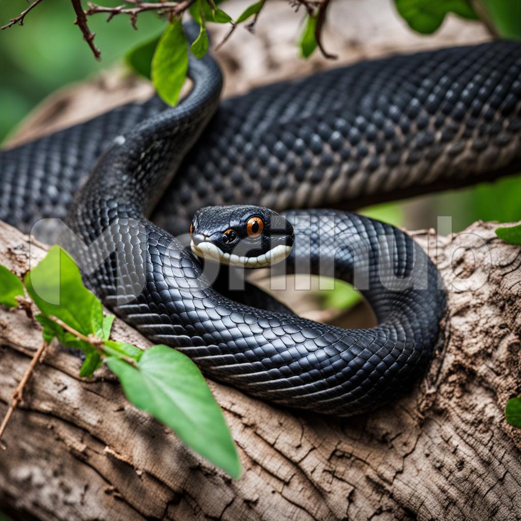 Coiled on a sinuous journey, a sleek black snake gracefully rests upon a tree branch, its glossy scales reflecting the dappled sunlight. With an unwavering intensity, its obsidian eyes fixate on a point, exuding an aura of quiet contemplation. The sinuous body suggests a poised anticipation, as if the tree branch is both a sanctuary and a vantage point for observing the world below. The tableau captures the essence of serpentine elegance and the primal allure of nature’s enigmatic gaze.
