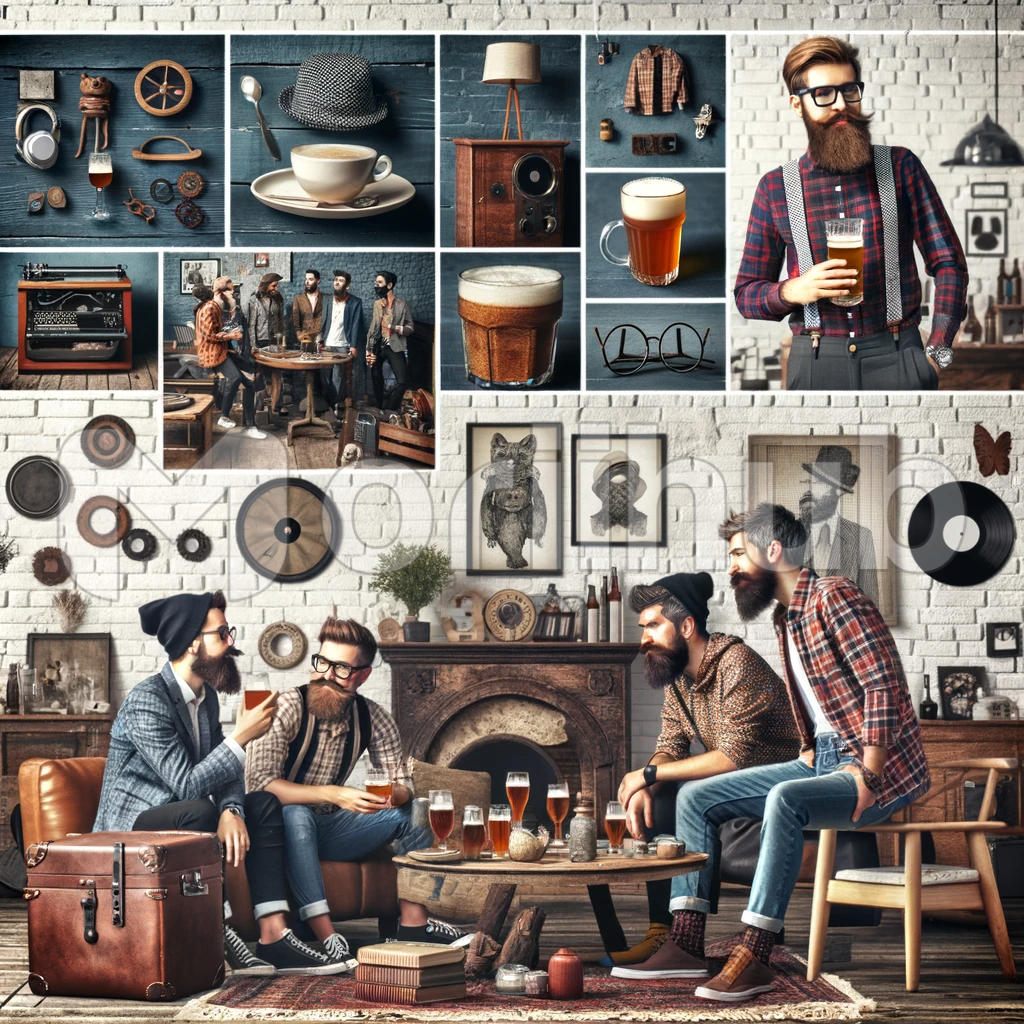 In this evocative image, a chic pub is a haven for hipsters, exuding a unique blend of nostalgia and modernity. Vintage furnishings, including retro leather couches and antique barstools, create a cozy, stylish ambiance. Patrons, donning vintage clothing and eclectic accessories, gather around rustic wooden tables, sipping craft beers and artisan cocktails. The warm, dimly lit space features exposed brick walls adorned with indie artwork and shelves stocked with vinyl records, all contributing to an atmosphere that effortlessly captures the essence of hipster culture.
