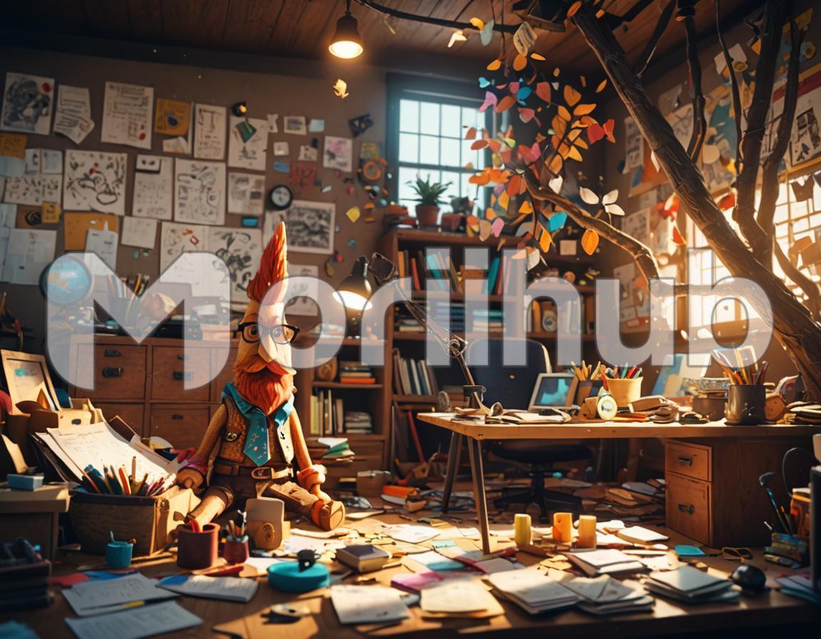 A quirky office is a delightful blend of creativity and individuality, where every corner tells a unique story. The space is filled with eclectic decor—vintage posters hang alongside modern art, while mismatched furniture pieces add character and charm. A bright orange chair sits beside a retro desk, its surface adorned with quirky knick-knacks like a ceramic dinosaur and a bobblehead figurine.
