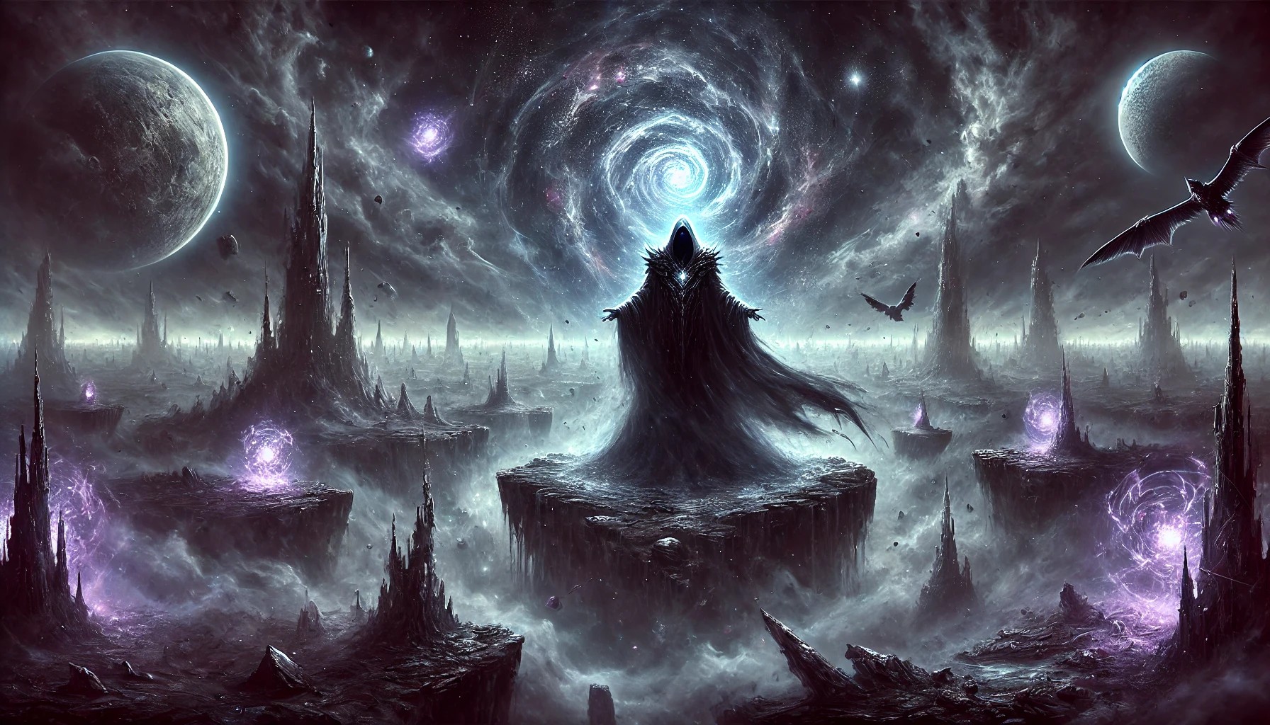The illustration portrays a haunting scene within the void, where the concept of emptiness and nothingness reigns supreme. At the center of the composition stands a dark sorcerer, cloaked in black mist that seems to devour the very air around him. His eyes shine with an eerie, ethereal glow, while his outstretched hands conjure a vortex of nothingness, a swirling void that pulls the surrounding reality into its dark abyss.