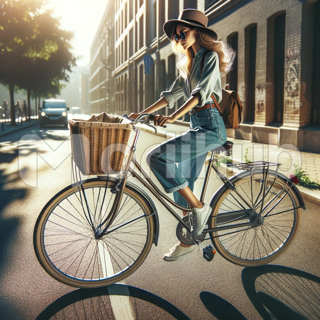 stylish female hipster effortlessly pedals her classic bicycle through a bustling city street. She exudes an air of effortless cool, dressed in trendy hipster fashion, adorned with oversized glasses, a vintage-inspired blouse, high-waisted skinny jeans, and retro sneakers. Her free-spirited aura and the classic bicycle form a perfect fusion of urban chic and vintage nostalgia, as she navigates the city with grace and confidence.
