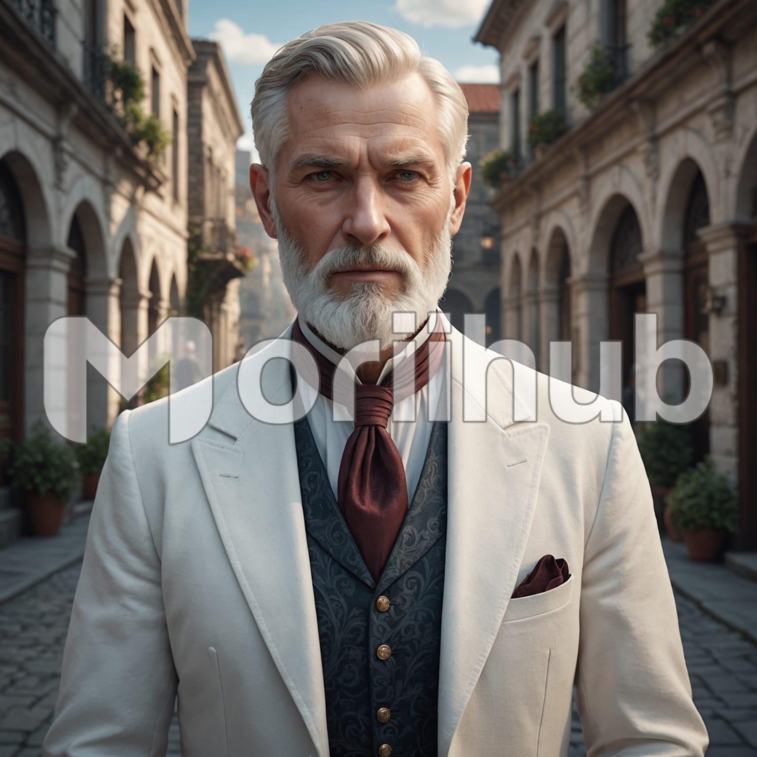 A middle-aged man stands with a composed demeanor, his short white beard neatly groomed and complementing his distinguished appearance. He is dressed in a well-tailored suit, the fabric rich and dark, adding a touch of sophistication to his look. The suit’s sharp lines and crisp details highlight his stature, while his confident stance and thoughtful expression convey both experience and authority. His overall appearance exudes a refined elegance, blending classic style with a modern touch, making him a figure of respect and confidence.