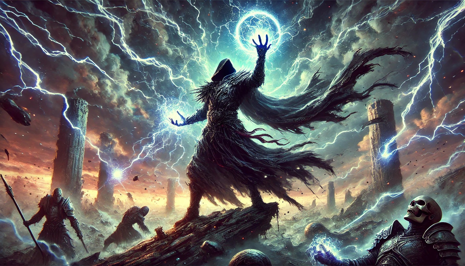 This illustration captures a breathtaking display of raw power in the midst of a crumbling battlefield. At the center stands a mighty sorcerer, their form radiating with an unstoppable force. With one hand, they summon a storm of divine lightning, crackling with energy that illuminates the sky. In the other, swirling dark magic coils and shifts, exuding a menacing aura.