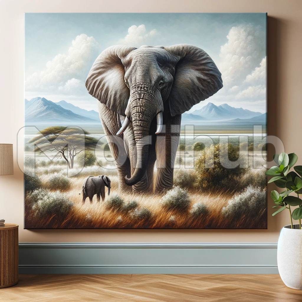 In this stunning canvas painting, an elephant takes center stage, its majestic presence brought to life with breathtaking realism. The artist has skillfully captured every intricate detail, from the texture of the elephant’s weathered skin to the depth of its expressive eyes. Against the backdrop of a sprawling savanna, the elephant stands tall and noble, its massive form commanding attention. The warm hues of the natural setting evoke a sense of serenity, with the golden grasses and distant horizon creating a harmonious contrast to the elephant’s strength and grace. This artwork is a testament to the artist’s talent in depicting the beauty and grandeur of the natural world.