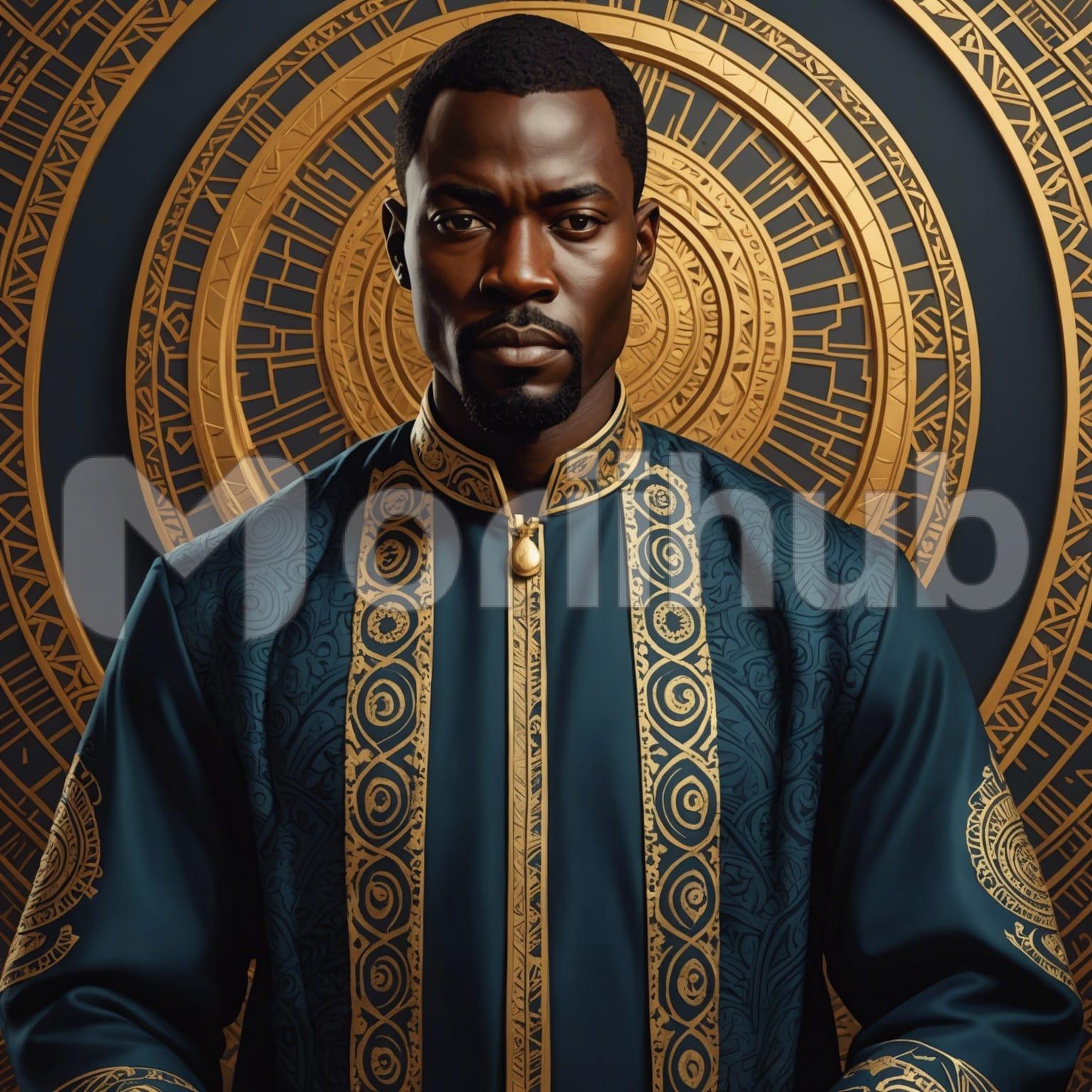 Adorned in regal attire, an African man commands attention with his dignified presence. His elegant garments, rich in color and tradition, drape him like robes of royalty. Each intricate detail tells a story of heritage and pride, woven into the fabric with expert craftsmanship. Against a patterned background reminiscent of tribal motifs, he stands as a symbol of resilience and strength. With a gaze that speaks of wisdom and resilience, he embodies the essence of his ancestors, a testament to the enduring spirit of Africa.