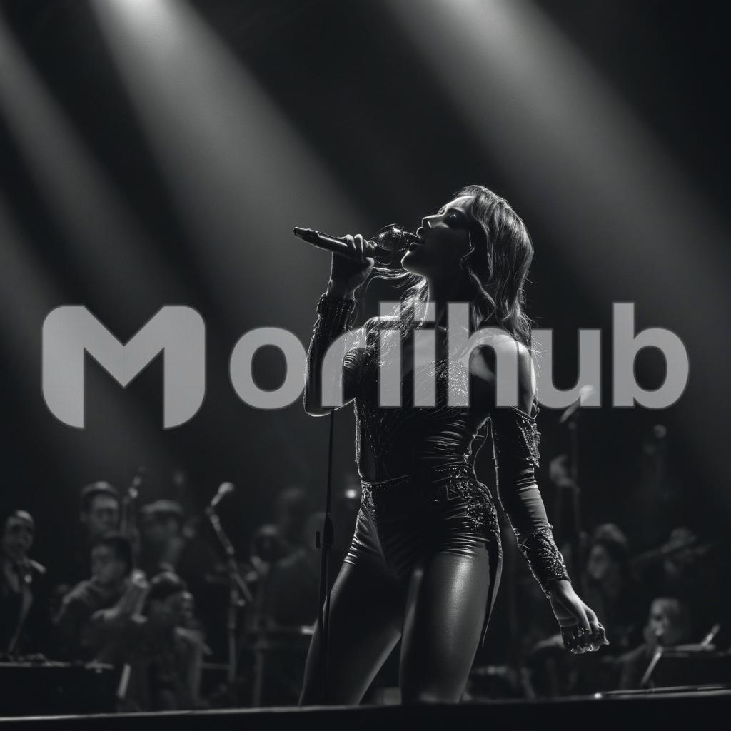 A singer performs on stage with passion, holding a microphone and captivating the audience. Vibrant lights illuminate the scene, enhancing the energy and emotion of the moment. The singer’s powerful presence and expressive gestures reflect a deep connection to the music, creating an unforgettable live experience for the crowd.