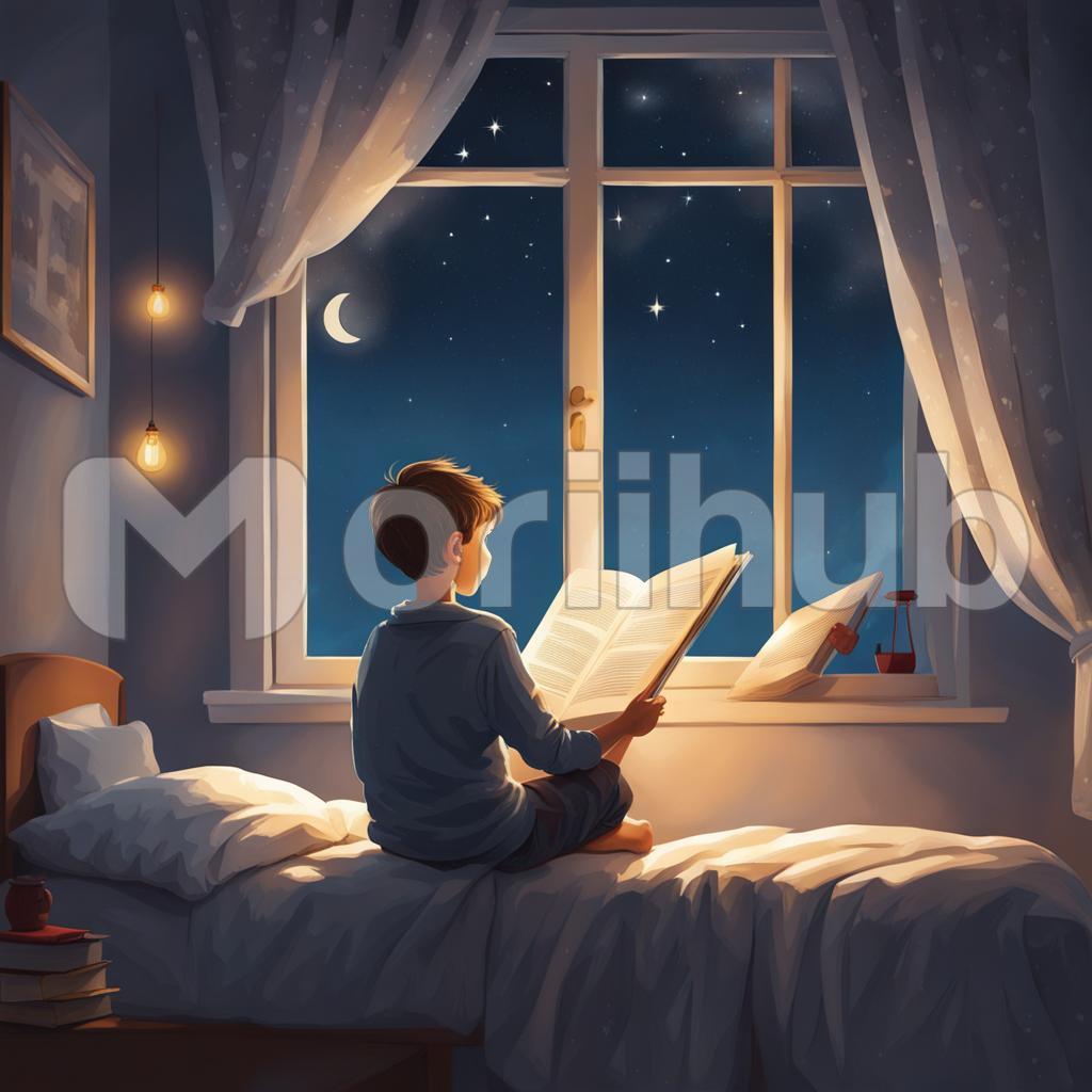 In a whimsical cartoon portrait, a boy sits by a window engrossed in a book. The night sky serves as a backdrop, adorned with twinkling stars. The warm glow from the window illuminates his animated expression, highlighting the joy of reading under the celestial canvas. This enchanting scene captures the magic of a young reader immersed in a world of imagination, accompanied by the serene beauty of the night sky outside.