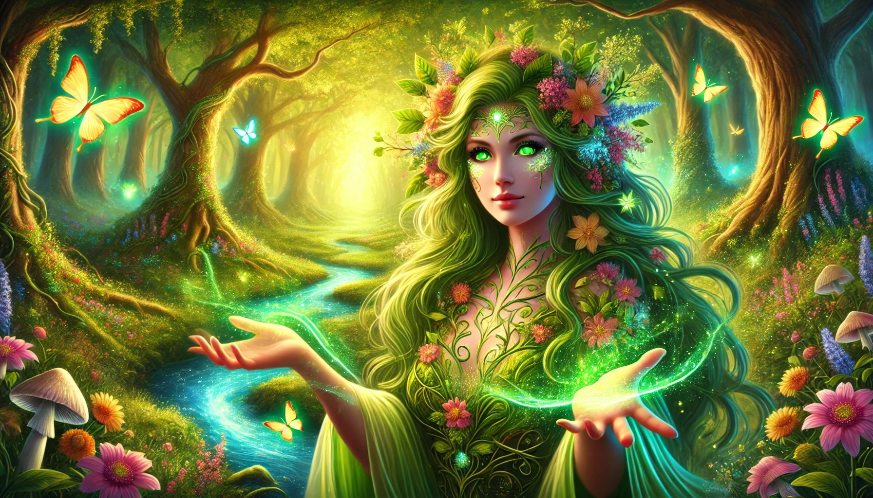 The illustration portrays a tranquil and enchanting scene in a vibrant, magical forest. At the heart of the image stands a beautiful druid, her serene face glowing with an ethereal light. Her deep green eyes reflect the surrounding lush nature, and her long hair, adorned with flowers and leaves, cascades gently around her face.