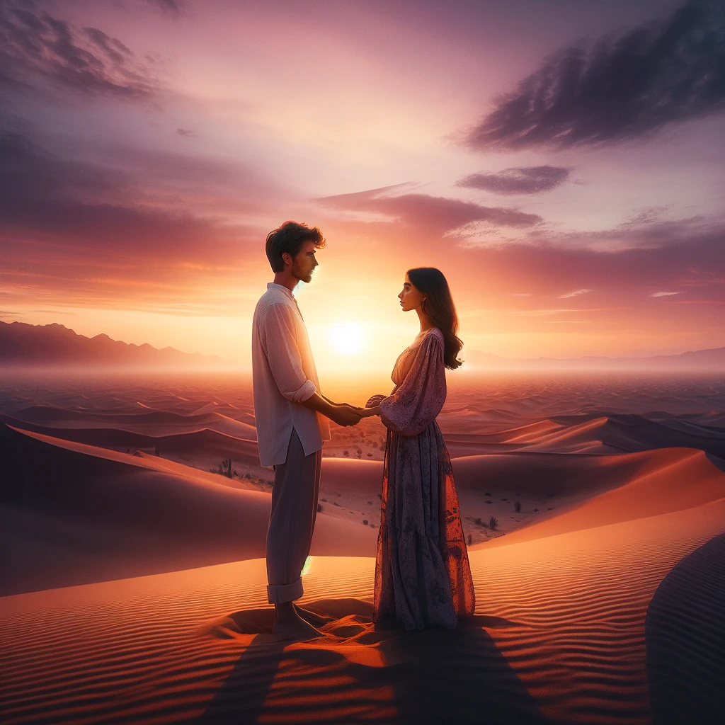 In the tranquil embrace of the desert at sunset, a love couple stands together, surrounded by the vast expanse of sand dunes. The sky above is a canvas of warm hues, painting the horizon in shades of orange and pink. Hand in hand, they share a moment of serenity and romance, their silhouettes etched against the breathtaking backdrop of nature’s beauty. In this quiet oasis, amidst the endless desert, their love shines brightly, a beacon of warmth and affection in the peaceful solitude of the desert landscape.