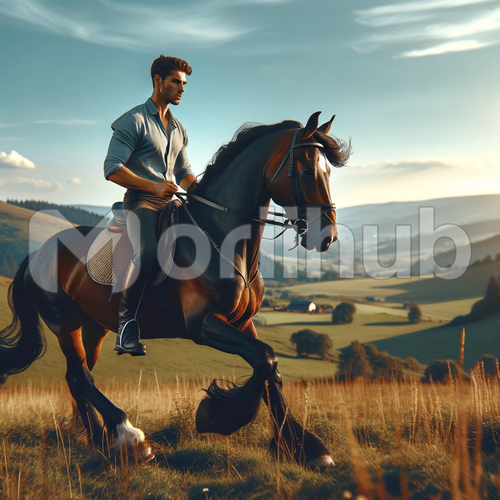 breathtaking outdoor tableau, where a man and a majestic horse unite in harmonious motion. The horse, an epitome of grace, boasts a glossy coat that shimmers under the sun’s gentle caress. With an elegant posture, it gallops with a powerful, rhythmic stride, its mane and tail trailing like banners in the wind. The rider, in perfect sync with the steed, embodies the spirit of adventure and freedom in this picturesque equestrian scene.