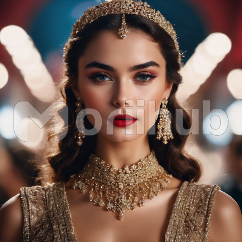 A strikingly beautiful woman captivates with her alluring presence, adorned in exquisite jewelry that shimmers in the soft light. Her gaze is unwavering, looking forward with an air of confidence and grace. The jewels, from glittering earrings to a delicate necklace, enhance her timeless elegance. Her poised demeanor and the radiant sparkle of her accessories combine to create a vision of effortless allure, leaving a lasting impression.