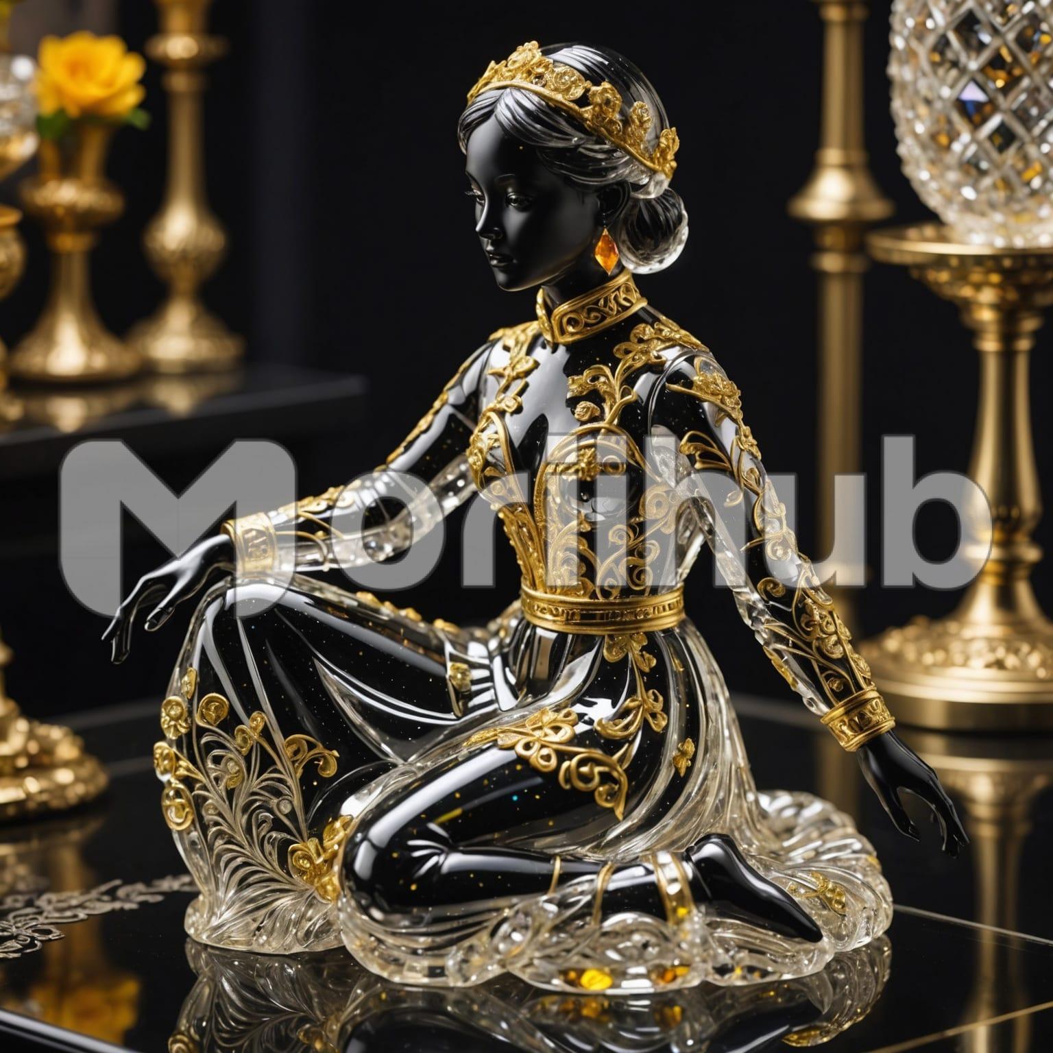On the tabletop, a striking black figurine of a woman sits with grace. Her silhouette is adorned with intricate gold designs, resembling a transparent gown delicately draped over her form. The gold patterns weave across her figure, tracing elegant lines that shimmer in the light. Despite her static pose, there’s a sense of fluidity and movement captured in the sculpture, as if she’s about to step into a dance. The contrast between the bold black and shimmering gold imbues the figurine with an air of sophistication and timeless beauty.