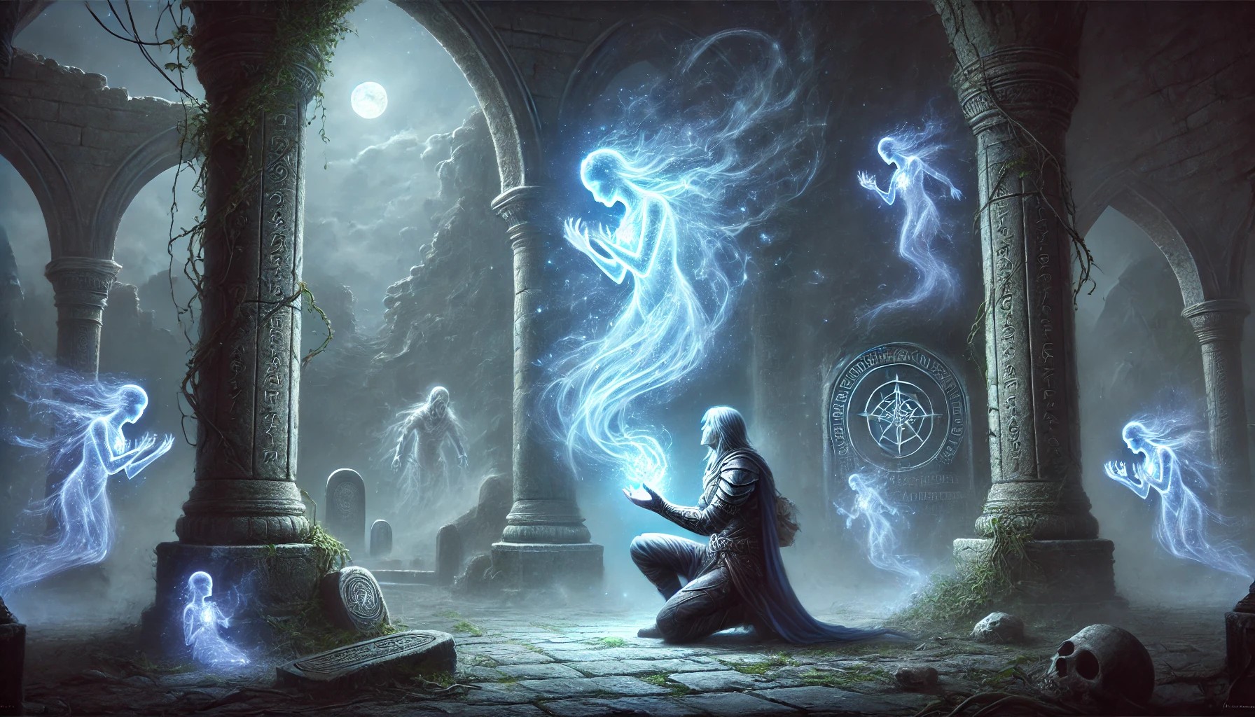 This illustration captures a soul-infused fantasy moment, set in the ruins of an ancient temple bathed in soft moonlight. A lone warrior kneels at the temple’s center, holding a shimmering, ethereal soul in their hands. The spirit glows with blue and silver light, drifting like mist, gradually taking the form of a lost loved one. The warrior’s face reflects a mix of sorrow and reverence, as if embracing a fate long awaited.