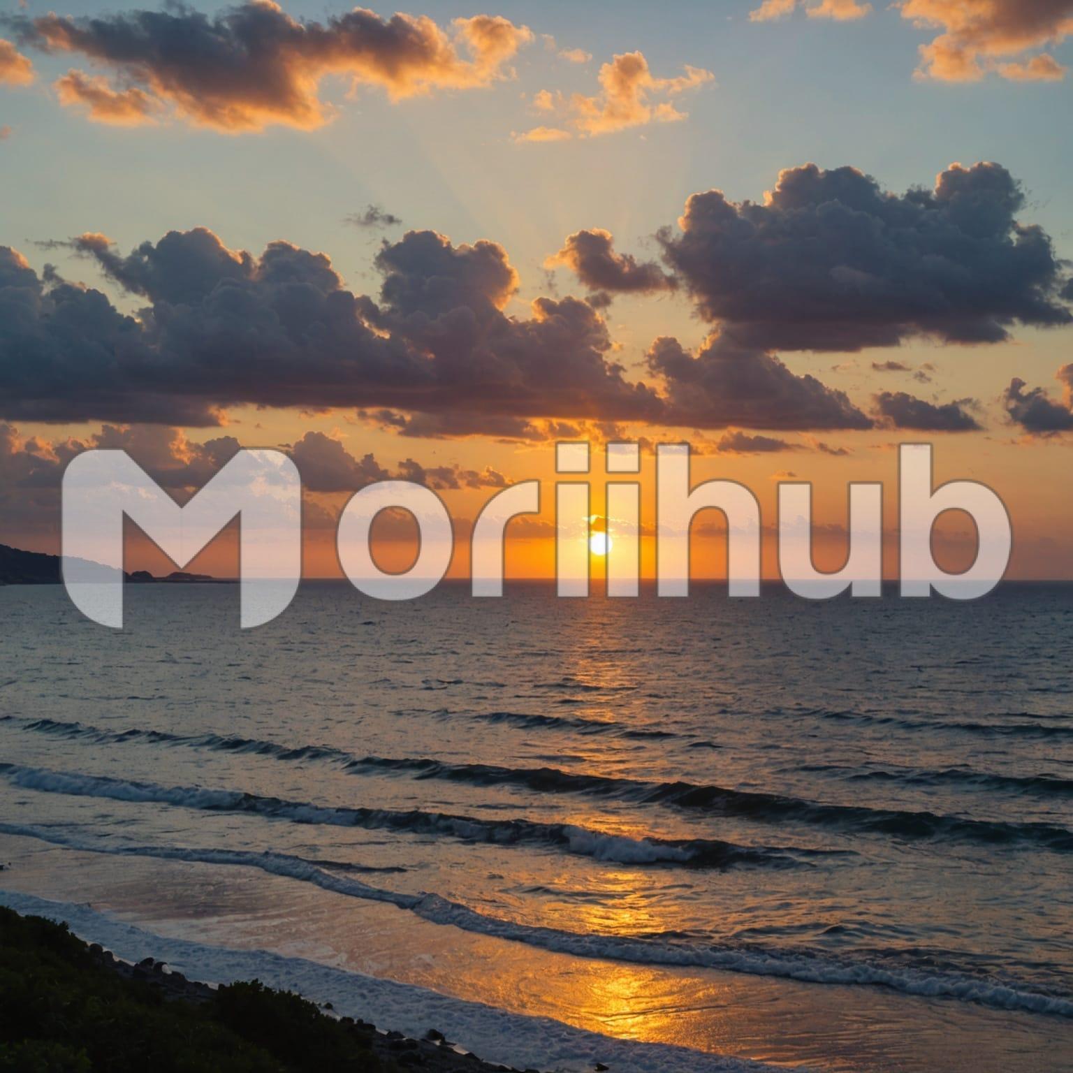 As the sun dips below the horizon over the sea, the sky transforms into a tranquil canvas, reflecting the fading light. The tranquil waters mirror this subtle change, creating a serene surface. Wisps of clouds drift across the sky, their delicate forms illuminated by the sunset, adding texture and depth to the scene. The clouds catch the last rays of sunlight, glowing softly against the deepening blue, while the sea embraces the serene end of the day.