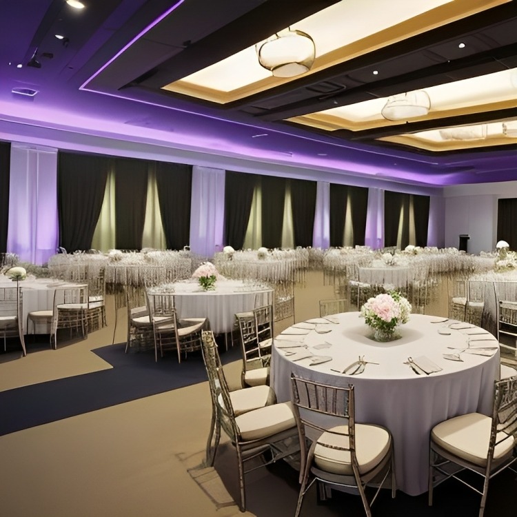 In the heart of the enchanting event center, elegant white round tables adorned the space, creating a sophisticated ambiance. Bathed in the soft glow of mesmerizing purple decor lights, each table became a canvas of grace and charm, casting a magical spell that elevated the entire atmosphere to a sublime symphony of beauty and refinement.