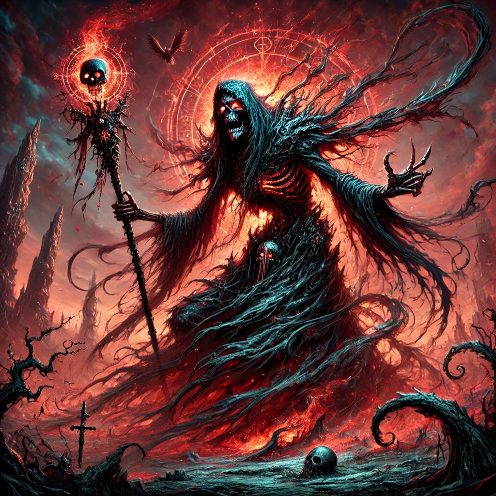 Evil avatar, a dark and malevolent being embodying pure wickedness and chaos. Its form is twisted and sinister, with a flowing cloak of darkness and skeletal features. The avatar’s eyes glow with a fiery, red light, and it radiates an aura of malevolence and fear. It wields a staff topped with a skull and adorned with dark runes.