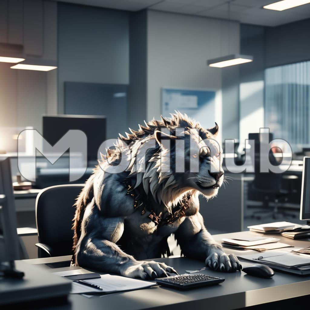 A beast seated in an office paints a vivid picture of a strikingly unusual and symbolic presence. Imagine a majestic and powerful creature,a mythical beast, occupying a modern office space. This juxtaposition of raw strength and corporate environment symbolizes a blend of untamed prowess with structured professionalism. The beast, seated in a sleek executive chair, embodies a commanding presence, bringing an aura of authority and confidence to the office. Its presence suggests a transformative force, where primal energy meets the refined world of business, emphasizing the unique combination of leadership, power, and influence in the professional realm.