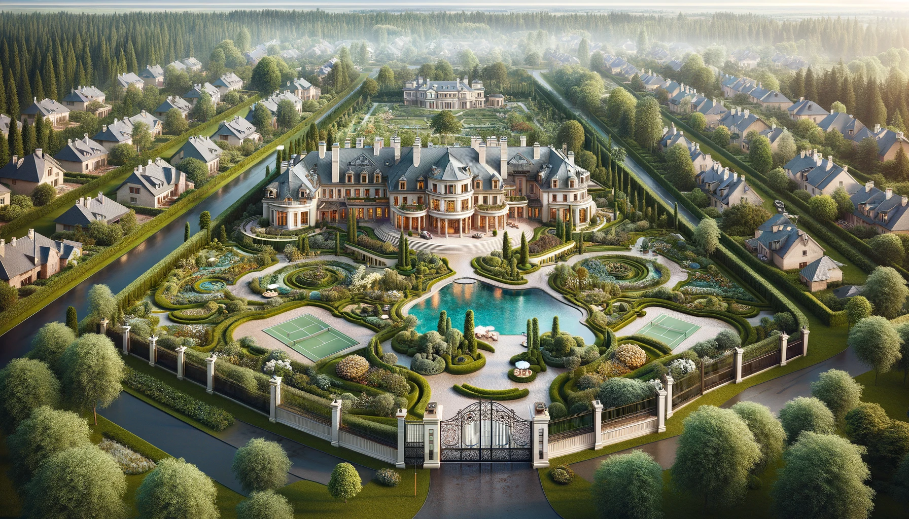 From above, behold the opulent estate—a sprawling mansion ensconced within meticulously landscaped grounds. Lush gardens frame the grandeur of the mansion, while manicured lawns stretch to the horizon. A testament to elegance and refinement, this aerial view captures the essence of luxury living amidst natural beauty.