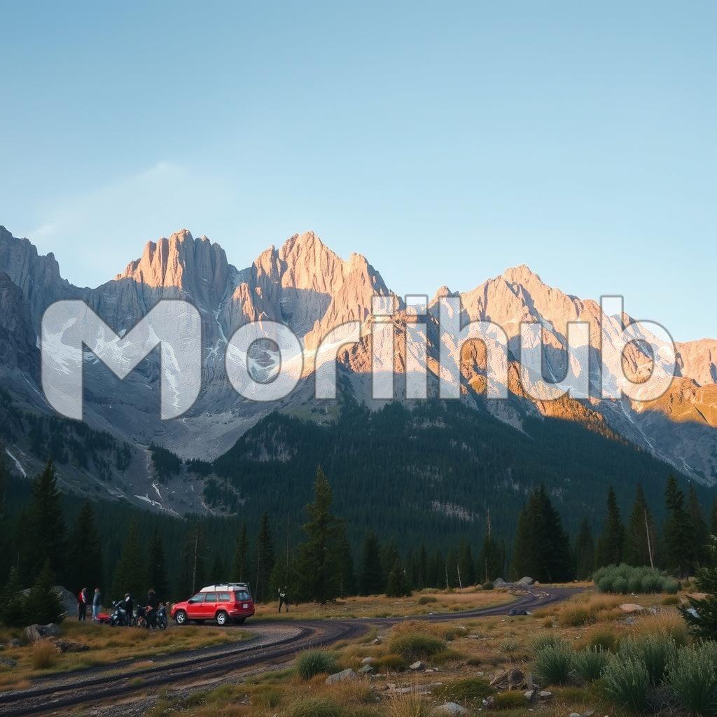 In the distance, several cars are parked along a winding road, their vibrant colors contrasting against the natural landscape. People gather nearby, chatting and laughing, their excitement palpable as they prepare for an adventure ahead. The majestic mountains rise prominently in the background, their peaks reaching toward the sky, cloaked in a mix of greenery and rocky terrain. The scene is alive with energy, with the sounds of nature harmonizing with the voices of those gathered, creating a sense of camaraderie and anticipation for the journey that awaits.
